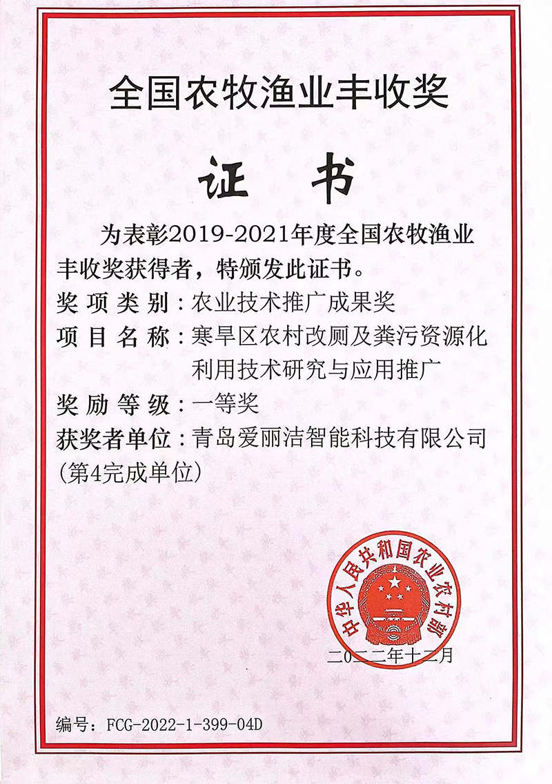 青島愛麗潔智能科技有限公司成立于2015年7月,注冊(cè)資金2000萬,是一家專注于提供農(nóng)村廁所解決方案、產(chǎn)品研發(fā)、生產(chǎn)和銷售于一體的企業(yè),已通過質(zhì)量管理體系認(rèn)證,先后被評(píng)為國家級(jí)“高新技術(shù)”企業(yè)、“專精特新”示范企業(yè)、榮獲德國當(dāng)代好設(shè)計(jì)優(yōu)勝獎(jiǎng)等諸多榮譽(yù),公司擁有碩士、博士組成的專家研發(fā)團(tuán)隊(duì),獲得國家知識(shí)產(chǎn)權(quán)局頒發(fā)的五十多項(xiàng)專利。我公司早在于2017年開始同“農(nóng)業(yè)農(nóng)村部規(guī)劃設(shè)計(jì)研究院”進(jìn)行密切合作,共同研發(fā)出適合我國“農(nóng)村廁所改造”和“糞污資源化利用”的專利產(chǎn)品,有效的解決了農(nóng)村廁所問題。